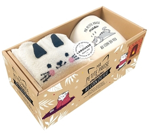 Ma petite pause miaou au coin du feu Un mug représentant un chat, accompagné d'une paire de chaussettes et d'un livret proposant une vingtaine de recettes, principalement de boissons chaudes ou réconfortantes : chocolat chaud, café viennois, latte au pain d'épices, vin d'hiver, entre autres.