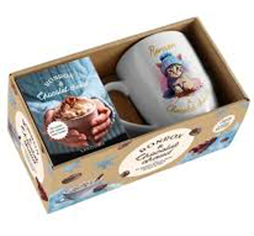 Ronron & chocolat chaud Coffret avec un joli mug en céramique et un petit livret.